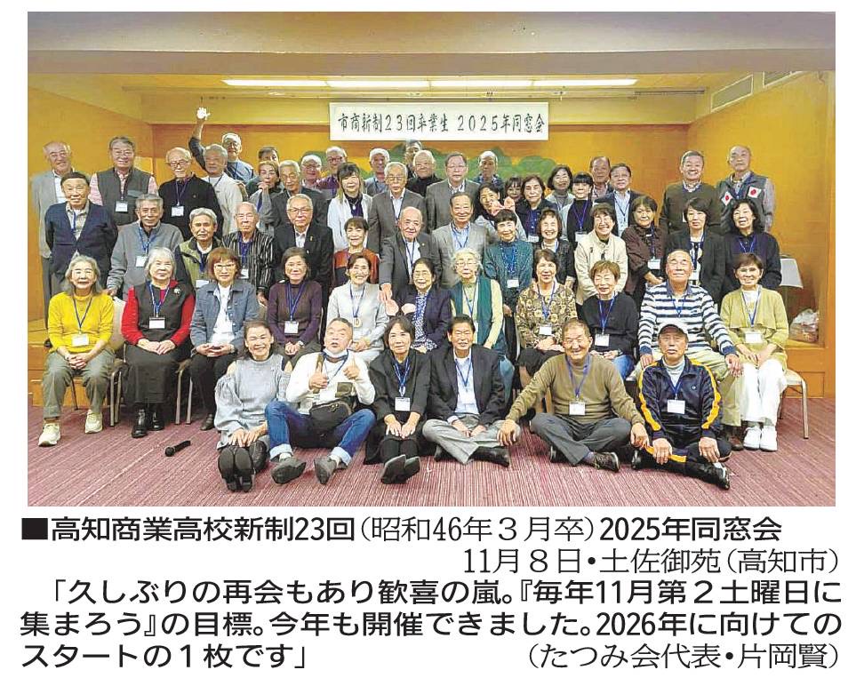 新制27回生の同窓会「卒業50年を楽しむ会」が去る4月12日(土)に高知会館で90人の参加を得て開催。その様子が高知新聞の「おきゃく」欄に掲載されました。記事によると「卒業50年の節目に学年同窓会を開催しました。県外からも含め90人が参加。懐かしく楽しい3時間があっという間に過ぎました。」とのことです。